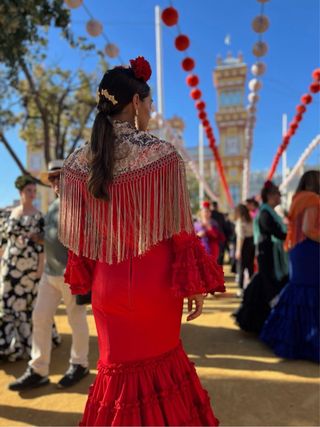 Traje de flamenca de color rojo, con un diseño elegante y lleno de movimiento. Bastante vuelo. Solo dos puestas. Perfecto estado. Posibilidad de vender los complementos aparte.