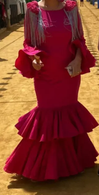 Traje de flamenca de mujer con un diseño elegante y volantes. Mas o menos equivale a una talla L, para más información, pregunten medidas. - Mangas largas con encaje. - Volantes en cascada en la falda.