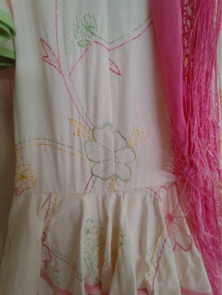 Precioso traje de flamenca, confeccionado con tela de lino y encajes de bolillo.