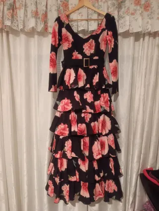 Traje de flamenca con un diseño llamativo y elegante. - Estampado de flores rosas sobre fondo negro. - Mangas largas. - Cinturón negro con hebilla dorada. - Falda con volantes en cascada. Sólo puesto un día. Está nuevo. No hago envíos