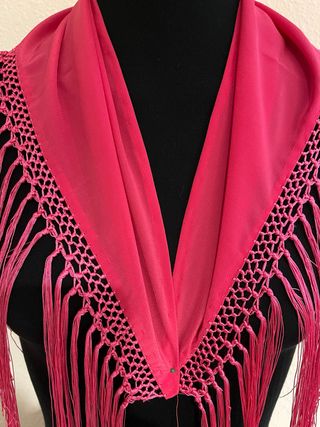 Mantoncillo de flamenca con un bonito estampado floral en tonos rosas y azules . Realizado totalmente a mano . Medidas : Largo parte sin flecos :100cm Largo espalda sin contar los flecos :35cm Largo enrejado y flecos :21cm