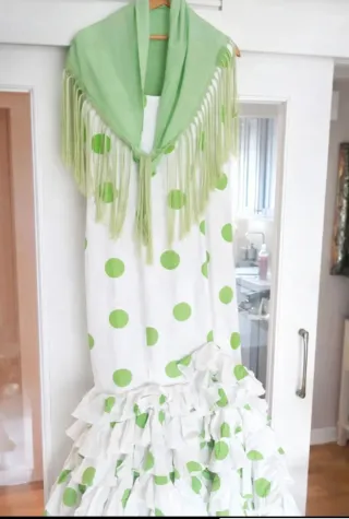 Vestido de flameca talla 40-42 con lunares de galleta en verde lima y mezcla de volantes de capa y pañuelo. Usado, pero en buen estado general. Es de escote cuadrado y, sin mangas, ideal para las calurosas Ferias y Romerías, al ser de algodón De pecho mide 51cm, 44cm de cintura, 54cm de cadera y 148cm de largo. Mantoncillo a juego