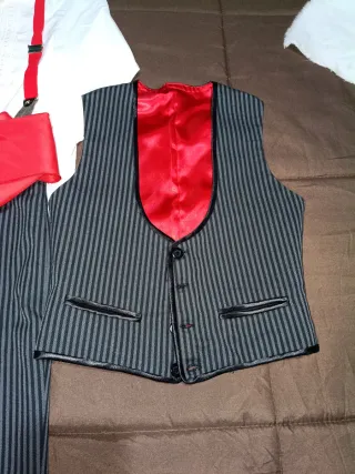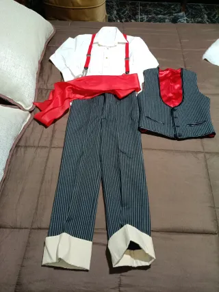 Conjunto de traje de gitano para niño, ideal para fiestas o actuaciones. - Camisa blanca. - Pantalón a rayas con vuelta. - Chaleco a rayas con forro rojo. - Fajín rojo. - Tirantes rojos.