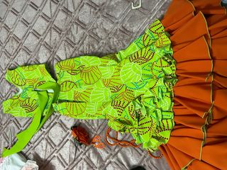 Traje de flamenca para niña con un alegre diseño. - Cuerpo en color verde con estampado de conchas y lunares. - Falda con volantes en color naranja. - Detalle de volantes en verde en la cintura. - Ribete en color verde lima en los volantes de la falda.