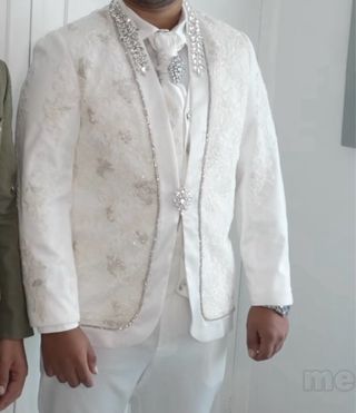 Elegante traje de novio gitano de tres piezas. América aplique de piedreria pantalon y camisa impecable - Chaqueta con detalles bordados y pedrería. - Chaleco a juego. - Pantalón a juego.