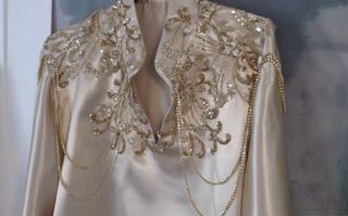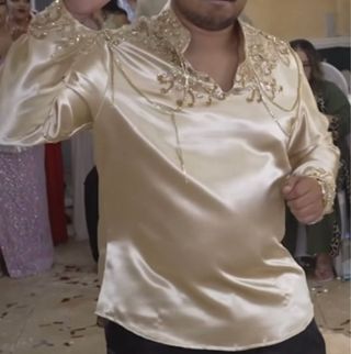 Elegante camisa de novio con detalles bordados y pedrería. - Diseño con cuello mao. - Adornos florales en dorado y pedrería. - Cadenas decorativas en los hombros.