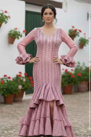 Traje de flamenca con un diseño elegante y volantes. - Mangas largas con volantes en los puños. - Cuerpo con escote en V y detalles de encaje. - Falda con múltiples volantes escalonados. - Adornado con un estampado circular y encaje.