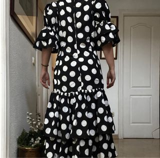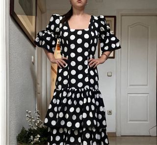 Traje de flamenca con un diseño clásico de lunares. - Diseño de lunares blancos sobre fondo negro. - Mangas con volantes. - Falda con volantes escalonados.