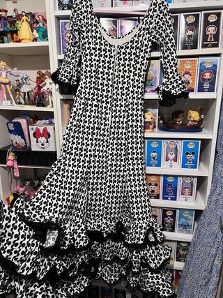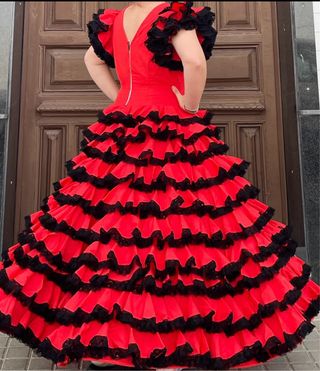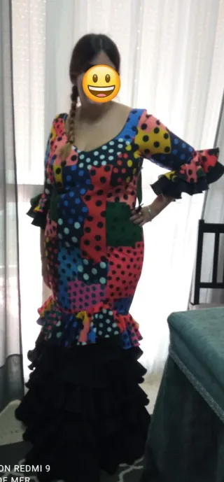 Traje de gitana muy bonito, usado pero en buen estado. El color negro está ligeramente aclarado por el uso y los lavados, algo normal en este tipo de tejidos, pero puesto se ve muy bien. Por ese pequeño detalle lo dejo a muy buen precio. Ideal para feria, romería o fiesta flamenca. 📏 Talla aproximada: M/L 💃 Muy favorecedor y con buena caída. Mando vídeo para que veáis que no se nota mucho, de echo en las fotos se ve Escucho ofertas razonables