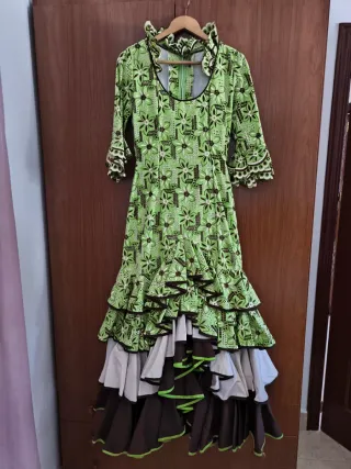 Traje de flamenca volantes verde y marrón