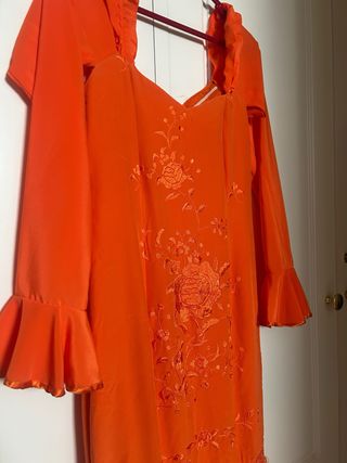 Traje de flamenca o gitana con un diseño vibrante y lleno de volantes donde predomina el color coral - Mangas largas de encaje con volantes. - Falda con múltiples capas de volantes. - Tejido principal en color coral - Detalles de volantes en verde y estampado