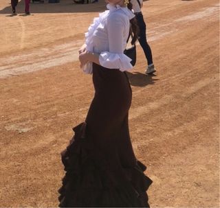 Traje de flamenca con volantes en la falda y mangas. - Blusa blanca con volantes hecha a mano. La talla de la blusa es una S - Falda larga marrón oscuro con volantes.