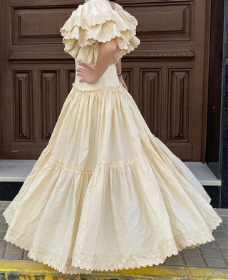 Tiene forro Tiene margen para empequeñecer el cuerpo del traje Usado 2 veces y muy bien cuidado Tiene un bolsillo debajo de los volantes En color vainilla En las dos fotos se pueden ver 2 desperfectos (con el montoncillo ninguno se ve pero igualmente tienen fácil arreglo) Se aceptan ofertas razonables