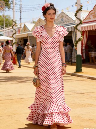 Vestido de inspiración flamenca, perfecto para ferias y romerías. Su diseño de lunares lo hace destacar. Talla S, M, L