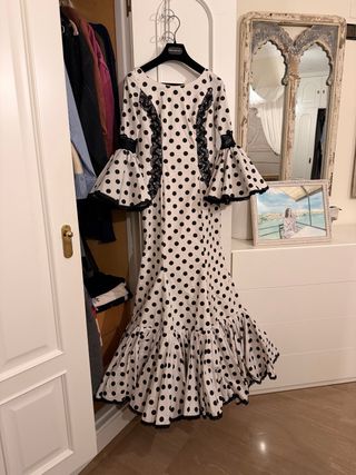Traje de flamenca con un diseño clásico de lunares. Puedes sacarle hasta 3 cm por lado - Base blanca con lunares negros. - Adornado con encaje negro. - Mangas acampanadas con volantes. - Falda con volantes y puntilla.