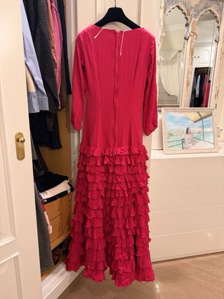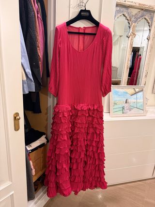 Vestido de flamenca rojo liso, elegante y muy favorecedor. Marca: El Corte Inglés Talla: 38 (los trajes de flamenca tallan pequeño, ideal una 34-36) Uso: solo 2 puestas, en muy buen estado Tiene volantes amplios con buen vuelo y detalles delicados en el tejido. Color rojo intenso, clásico y atemporal. Ideal para Feria de Abril, romerías o eventos flamencos.