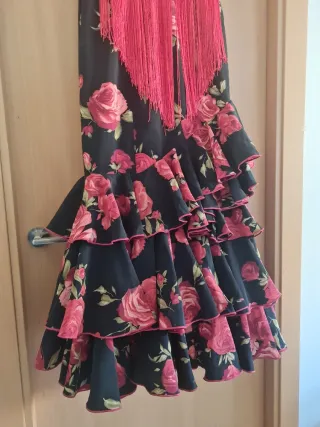 Traje de flamenca con un diseño vibrante y lleno de movimiento. Medidas en las fotografías. - Cuerpo con escote en V y detalle de flecos rojos. - Falda larga con múltiples volantes. - Estampado floral de rosas rojas sobre fondo negro.