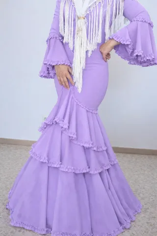 Traje de gitana de color lila, con volantes y mangas canasteras - Diseño con 3 volantes en la falda. - Mangas canasteras con volantes en los puños. - Escote de pico por delante y por detrás - Yo lo llevo con una enagua cancán para que de más volumen