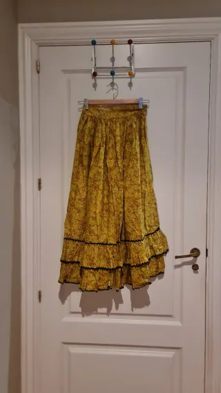 Traje de flamenca o de gitana con un diseño vibrante y volantes. - Cuerpo amarillo con lunares pequeños en negro. Tela popelin de Julian Lopez ( Sevilla) - Falda larga amarilla con lunares negros grandes y pequeños. Encajes en la punta. - Múltiples volantes en la falda y en las mangas. - Forrado el cuerpo - bolsillo interior - talla 38 holgadita por la cadera y mas estrecha por arriba. Para altura 170 con zapato plano o 165 con tacon. El mantoncillo no se incluye. No tiene marca porque es hecho a medida. Medidas aprox en plano de costura a costura: Pecho 46 cm medido por delante Cintura 37 cm Cadera 50 cm Largo 150 cm