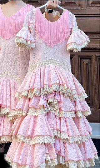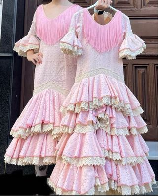 Precioso traje de flamenca con un diseño muy especial. - Adornado con flecos dorados en el escote. - Detalle de encaje en la cintura. - Falda con volantes en tonos rosas y beige. Uno es la talla 36 y el otro es de niña para 5 años más o menos , tiene un poco para sacar llevan la flor y peineta a juego