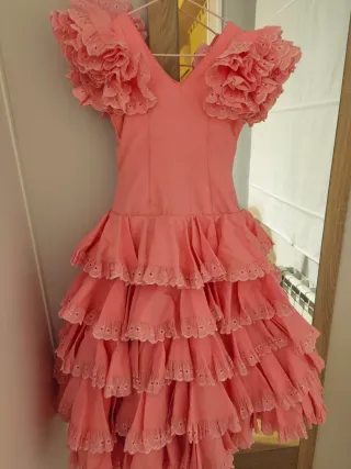 Traje de flamenca o gitana de niña color coral (no incluye mantoncillo). Talla 28. Pecho 37 ctms / Largo 97 ctms / Cintura 34 ctms. ---- Girl's flamenco or gypsy costume in coral color (shawl not included). Size 28. Chest 37 cm / Length 97 cm / Waist 34 cm. ---- Costume de flamenco ou de gitane pour fille de couleur corail (châle non inclus). Taille 28. Poitrine 37 cm / Longueur 97 cm / Taille 34 cm. ---- Fato de flamenco ou cigana para menina em cor coral (xale não incluído). Tamanho 28. Peito 37 cm / Comprimento 97cm / Cintura 34 cm.