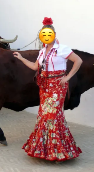 Vendo precioso vestido de gitana en color rojo vibrante, un clásico que nunca falla. Se trata de una pieza exclusiva confeccionada a medida por encargo, con acabados de alta calidad que no encontrarás en trajes de serie. El diseño cuenta con un elegante escote en "V" tanto en el pecho como en la espalda, lo que estiliza muchísimo la figura. El cuerpo es entallado hasta la rodilla, abriéndose en una falda con un volumen impresionante: tiene una densidad de volantes superior a lo habitual, lo que le aporta un movimiento y un vuelo espectaculares al caminar o bailar. Está en perfecto estado, muy bien cuidado.