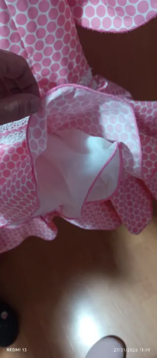 Traje de gitana color rosa. Para una niña entre 5 y 7 años aproximadamente, puesto sólo un día. Con forro interior. Medidas: Un metro de largo desde el hombro hasta el último volante y 27 cm de ancho, aunque también tiene para poder sacarle más de ancho.
