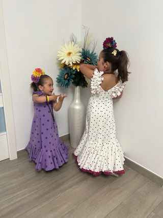 Precioso traje de gitana para niña, ideal para ferias o romerias. - Diseño de lunares en color lila. - Talla para 3 años aunque tiene tela para sacarle de ancho y del bajo. - Volantes en el bajo y mangas. Regalo adorno floral