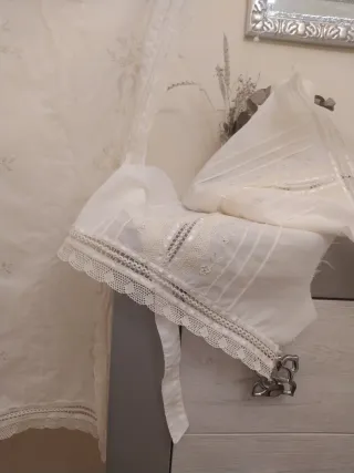 Tela de primera calidad color beis bordado y puntillas de bolillos precioso ,por estrenar.medifas largo 80cm por 75 ancho.sive para niña a partir de 10 años y adulta