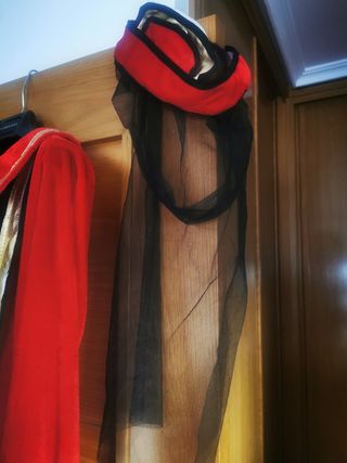 Este disfraz de estilo medieval es ideal para eventos temáticos o representaciones. - Diseño con detalles dorados. - Incluye tocado a juego. - Tela con acabado satinado. Es como para una talla 48 o así Tiene restos de pegamento Está sin usar