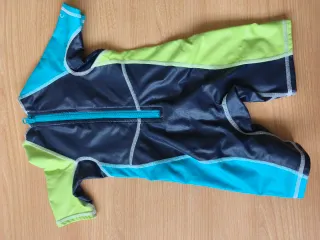 Traje de baño de neopreno para niño de la marca Tribord, ideal para actividades acuáticas. - Color azul y negro. - Mangas cortas y perneras cortas. - Material de neopreno. - Cierre cremallera trasera. - Talla 4