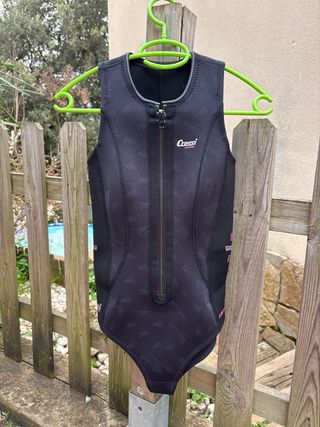 Traje semiseco de buceo Cressi Ice 7 mm – mujer XS (talla 1) + gorro Descripción: Traje semiseco de 7 mm, ideal para aguas frías o si eres friolero. Usado durante la pasada temporada de verano, está en buen estado de uso funcional. Detalles importantes: • Bolsillo lateral de la pierna un poco descosido. • Cremallera trasera: el tejido alrededor ha saltado ligeramente, mostrando signos de uso, pero su función de sellar está perfecta. Incluye: gorro original. Perfecto para buceadoras que buscan confort y calor, con un traje que funciona al 100% pese a los signos de uso. Lo vendo por cambio de talla.