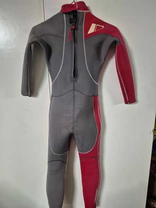 Traje de neopreno para niño, talla 10, de manga larga. Es de color rojo y gris, y se encuentra en buen estado, aunque presenta algunas pequeñas marcas de uso. Cremalleras en buen estado - Neopreno de manga larga. - Talla 10. - Color rojo y gris.
