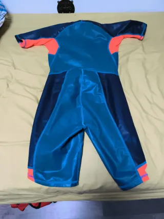 Traje de neopreno corto para niños, ideal para actividades acuáticas. Diseñado para ofrecer comodidad y protección. - Color principal azul verdoso. - Mangas y detalles laterales en naranja. - Paneles laterales en negro. - Cremallera frontal para facilitar su uso. Poco uso. Dispongo de 2 unidades, 5€ cada uno
