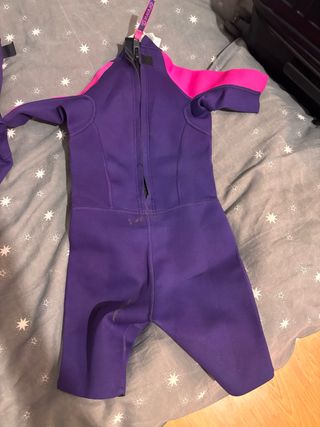 Traje de neopreno para niñ@s, ideal para actividades acuáticas. - Color morado con detalles en rosa. - Manga corta. - Cremallera frontal para facilitar su uso. Creo que serviria para 5 o 7 años