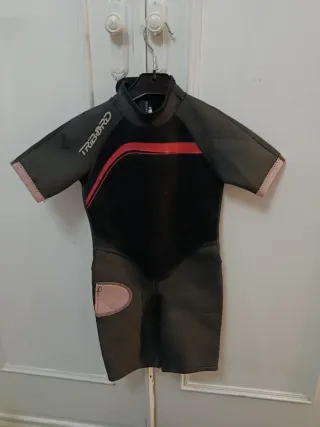 Traje de neopreno de manga corta y pierna corta, ideal para actividades acuáticas. - Color negro y rojo. - Cierre de cremallera. - Marca Tribord.