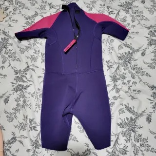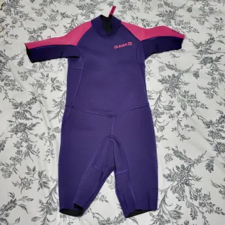Traje de neopreno corto para niños de la marca OLAIAN, comprado en Decathlon. Tejido ligero con aislamiento térmico para piscinas cubiertas, clases de natación y para usar en el mar, disfrutando del agua sin pasar frío. - Talla 6 años - Usado solo 2 o 3 veces - Color morado con detalles en rosa - Mangas cortas - Piernas hasta la rodilla - Cremallera en la espalda con tirador - Se seca con rapidez