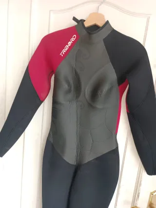 Se vende Traje de Neopreno de surf Tribord para chica, talla 40 (equivalente a S). Ideal para actividades acuáticas. 3mm de neopreno - Diseño en color rojo, negro y gris. - Cuello alto. - Mangas largas.