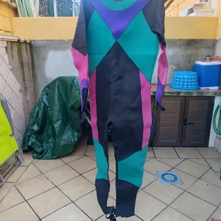 Traje de buceo de neopreno con un diseño llamativo - Mangas largas y perneras largas. - Combinación de colores: negro, verde, morado y rosa. - Cuello alto.