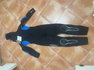 Traje de buceo completo con cremalleras en los tobillos y muñecas. Talla S, en muy buen estado. Solo tiene una tara en la zona del gemelo de la pierna izquierda, pues el forro en un pequeño trozo está debilitado, de ahí el precio.5 mm - Paneles de neopreno en contraste. - Rodilleras reforzadas. - Logo de la marca en el pecho y en la manga.