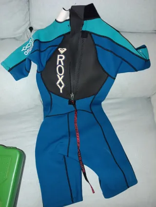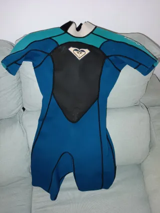 Traje de neopreno Roxy de manga corta para mujer, talla 36 - Color azul y turquesa. - Logo de Roxy en el pecho. - Cierre de cremallera en la espalda. Está usado pero muy bien conservado, sin roturas ni daños. Perfecto para surf, bodyboard o deportes acuáticos.