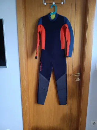 Traje de neopreno infantil de manga larga y pernera larga. Ideal para actividades acuáticas. - Combinación de colores azul marino, naranja y gris. - Cierre con cremallera en la espalda. - Costuras planas para mayor comodidad.