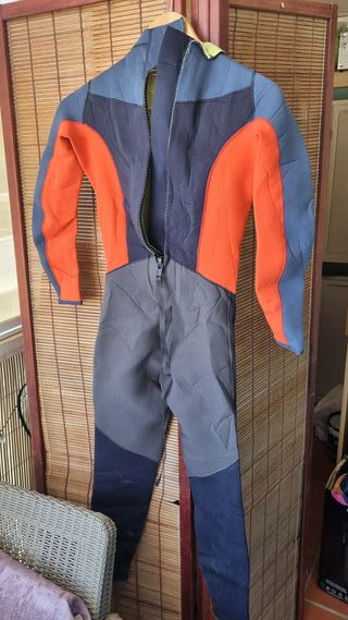 Traje de neopreno integral de 3mm, ideal para actividades acuáticas. Marca Decathlon. Talla 14, Talla S, modelo Wetsuit 500 - Diseño multicolor con paneles en azul marino, gris y naranja. - Cremallera frontal para facilitar su uso. - Costuras reforzadas para mayor durabilidad.