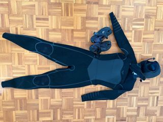 Conjunto de neopreno y accesorios para buceo. - Traje de neopreno completo con cremallera frontal. - Chaleco de neopreno corto. - Escarpines de neopreno. - Gorro de neopreno. - Aletas de buceo. Conjunto de buceo, el traje largo 6.5 mm talla M , lo he usado muy poco mido 1.74 unos 75 kg. El corto de 5mm sin usar. Escarpines Nº42