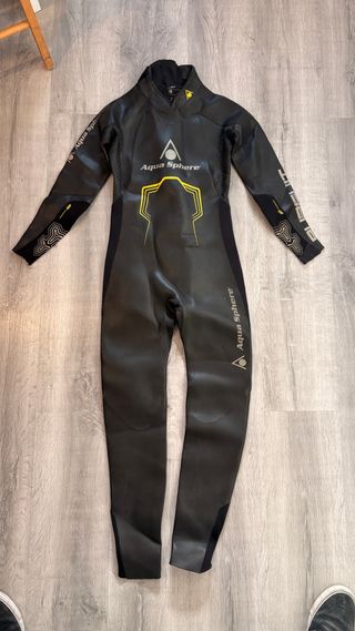 Traje de neopreno de natación de la marca Aqua Sphere. - Diseño en color negro con detalles en amarillo.