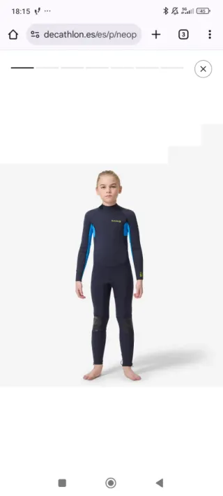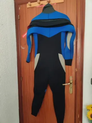 Traje de neopreno Olaian para aguas templadas. - Color principal azul marino. - Mangas con detalles en azul claro. - Rodilleras reforzadas. - Cremallera en la espalda. - Precio original 29€ ,99€ decathlon - el pack con todo, chaqueta y escarpines, 60€