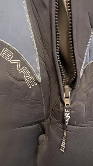 Traje de neopreno BARE de 7mm, ideal para actividades acuáticas. - Color negro y gris. - Cremallera frontal. - Rodilleras reforzadas. - Logo de la marca BARE en el pecho. - Logo de la marca BARE en la manga.