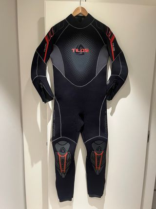 CÓMO NUEVO! Traje de neopreno Tilos de 5mm, ideal para actividades de buceo, talla M - Usado 5 inmersiones. - Diseño en color negro con detalles grises y rojos. - Cremalleras en los tobillos y muñecas. - Refuerzos en rodillas y espinillas. -Doble sello en tobillos y muñecas. -Talla M