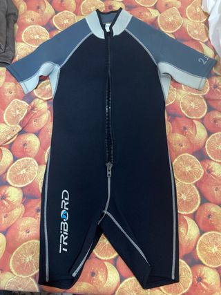 Traje de neopreno corto de la marca Tribord, ideal para actividades acuáticas. - Color principal negro con detalles en gris en las mangas. - Diseño de manga corta. - Cuello alto. - 90cm largo x 44cm pechox 40cm cintura