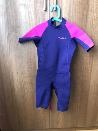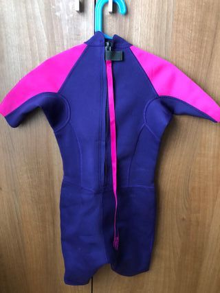 Traje de neopreno para 5-6 años, ideal para actividades acuáticas. Usado muy poco - Color morado y fucsia. - Cremallera frontal para fácil acceso. - Mangas cortas.
